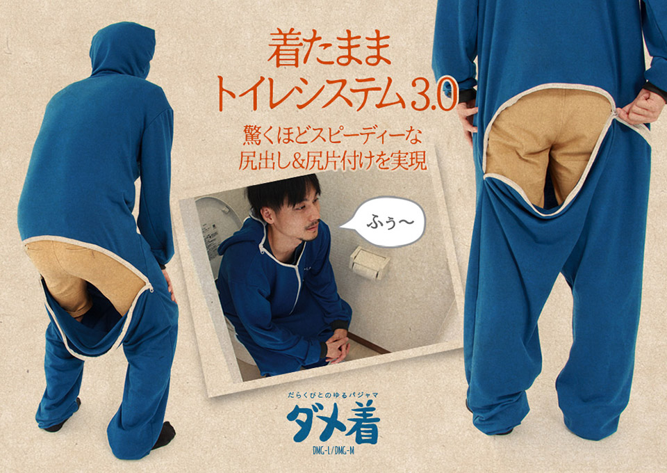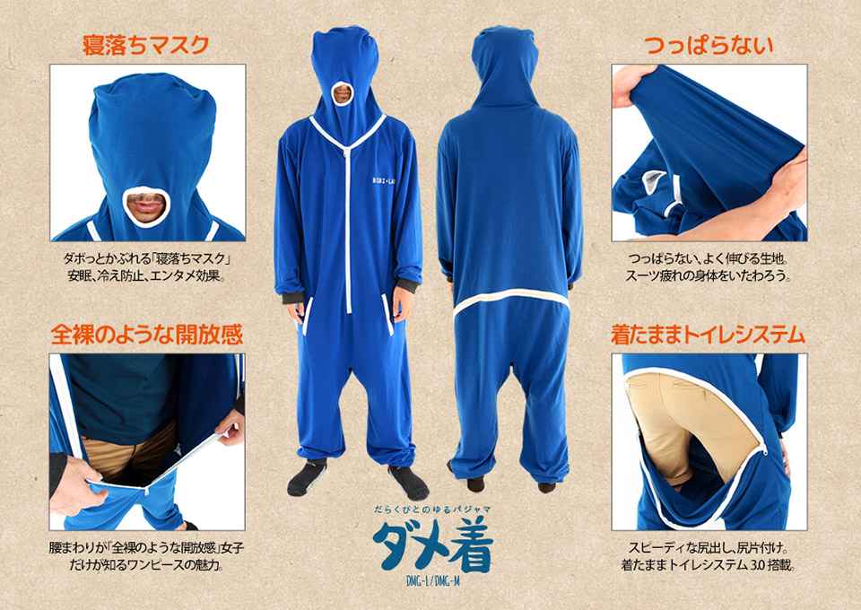 Com o nome de Dame Gi essa roupa faz vc literalmente virar um saco de dormir. Feito de material leve, mas quente, os criadores dizem que a roupa não tem somente os zíperes como abundância de recursos, mas também inúmeros benefícios para quem enfrenta o inverno no Japão. Dependendo da região pode enfrentar muito frio e muita neve, com temperaturas inferiores a -20° C, porém, a temperatura média da maior parte do Japão gira em torno de 3° C a -1° C.